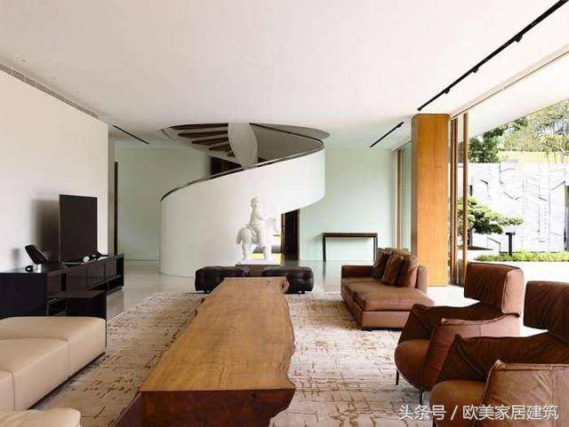 内部反映了房主对自然的热情和建筑师的努力, 以建造一个散发这种爱的住所。虽然配色方案保持在很大程度上中性与白色控制内部, 智能木表面的加法带来温暖和纹理对比即刻。一个令人惊叹的螺旋楼梯增加了雕塑吸引力的装饰, 甚至作为一个可爱的生活区, 厨房, 娱乐中心和饭厅完成较低的住宅水平。