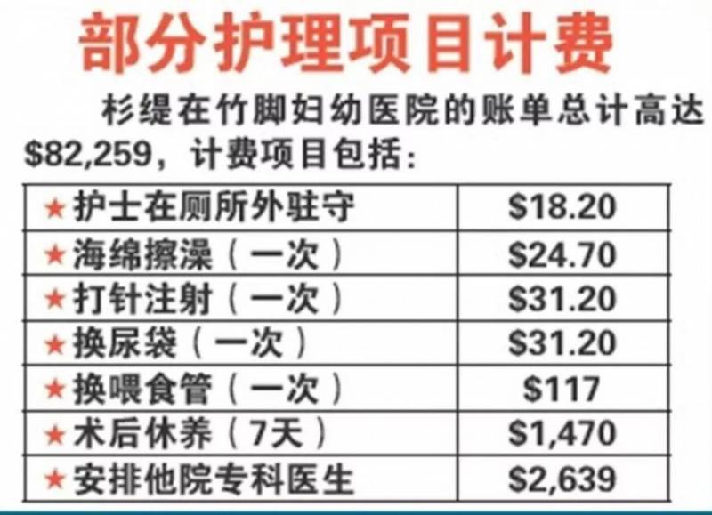 虽然她住的是B2级病房(相对低廉的病房),但却因为是外籍人士无法享有津贴,医药费高达8万2559元。被账单惊呆的杉缇要求医院明列细目,结果发现护士为她进行的“一举一动”都算在她的账上。