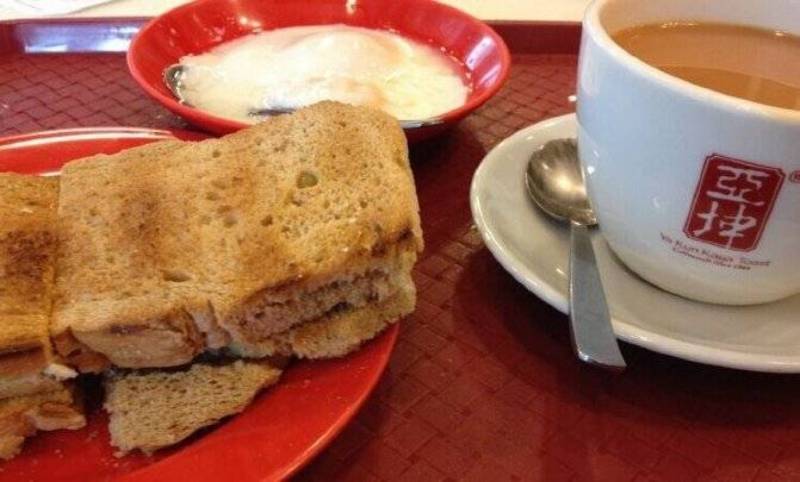 咖椰烤土司烤成金黄色,涂满牛油和咖椰酱香脆可口,搭配一杯冰咖啡,爽极了!