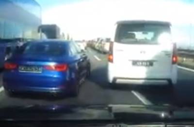 女网民丽兹揭露,当时她正往关卡方向行驶,有一辆巴士正好发生故障,因此停在在最右边的车道上,休旅车刚好就在巴士后方,司机为要换车道而打信号灯,但蓝色奥迪轿车却不让路。