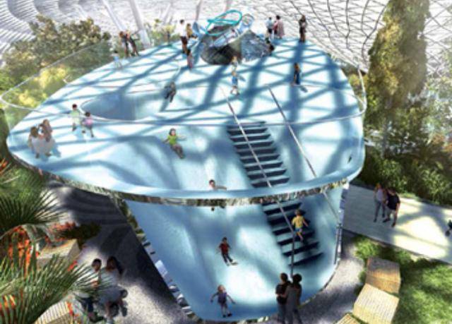 设于室内花园环境的巨型倾斜式平台,设有四种巨型滑梯让大人小孩一起玩乐。