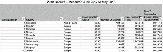 英国 Cable.co.uk 网站公布全球 200 个国家宽带网络下载速度排名榜,新加坡以平均下载速度为 60.39 Mbps 的网速夺得冠军,相当于下载一部 5GB 的高清电影仅需要 11 分钟,这网速太给力了!第二名和第三名分别是瑞典(46.00Mbps) 和丹麦(43.99Mbps)。