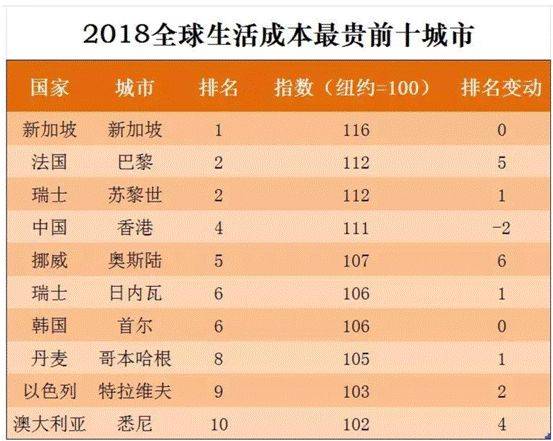 英国经济学人智库发布了《2018 年全球生活成本报告》,对比衣、食、行开支等三方面,新加坡连续第五年被评为全球物价最高的城市,其次是巴黎和苏黎世。
