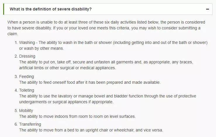 根据政府的规定,受保人在6项日常起居活动中丧失至少3项自理能力时,才能向有关保险公司提出索偿。这6项日常起居活动包括盥洗、更衣、进食、如厕、行动(在室内走动)及移动(从床上坐上椅子或轮椅)。