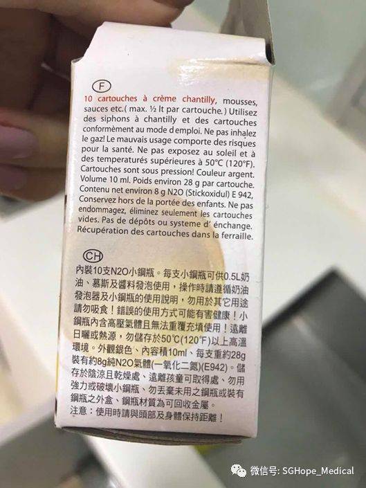 原来这是纯N2O气体,一般用来给奶油、慕斯及酱料发泡使用。但是那句“请勿吸食!错误的使用方式可能有害健康!”,偌大的两个感叹号又是怎么回事呢?用于食物发泡,又可能有害健康?那我还能不能吃奶油、慕斯什么的了?