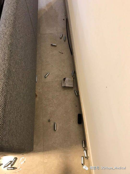 再次回到我们一开始提到的那几名就读于私校的学生,除了房间里整箱整箱的笑气弹,房间的卫生状况也非常糟,综合各方面的情况,这帮学生也是在打笑气无疑了。从一开始的照片我们也可以感受到,沉浸于笑气所带来的欣快感中的他们,连尊严都不一定能够维持,哪里还顾得上维持房间的整洁呢?(打笑气的人生活可以过的多糟可以参见《最终,我坐着轮椅被推出了首都国际机场》文)