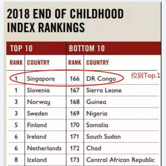 在175个国家中,新加坡与卫冕冠军斯洛文尼亚并列第一,1000分的总分新加坡获得了987分,这表明孩子可以在新加坡有个美好童年!