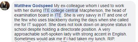 生前刘惠玉老师待人温柔又爱笑。她的同事们得知消息后,在脸书沉痛哀悼。称其尽管在学校待人平等,经常讲有口音却很温柔的英语。