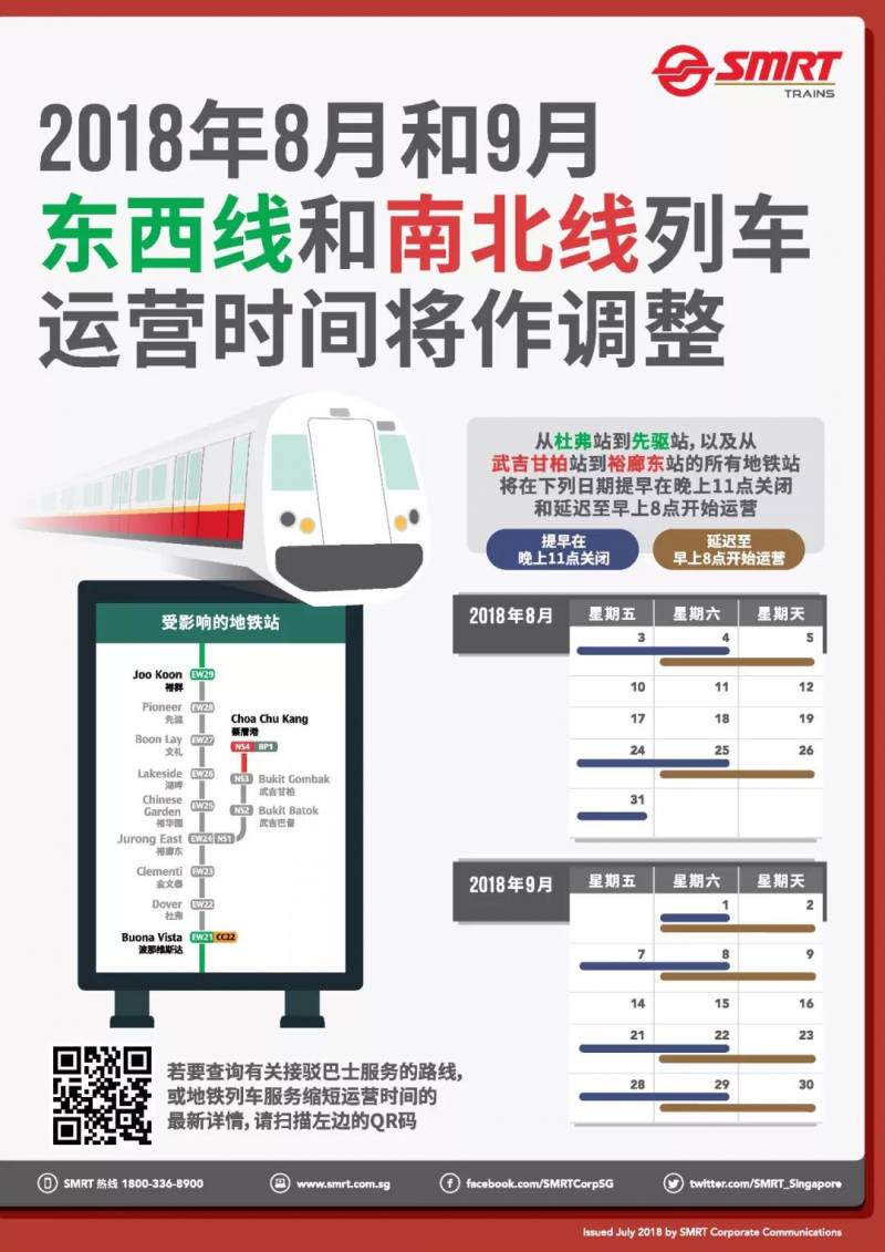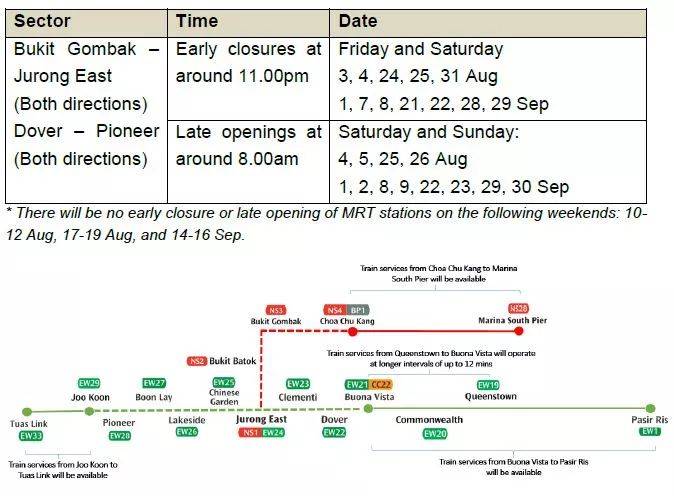 SMRT今天(18日)发布公告表示,在来临的八月和九月,东西线从杜佛到先驱的七个地铁站,以及南北线从武吉甘柏到裕廊东的三个地铁站将受到影响。
