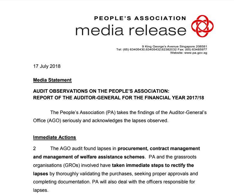 被AGO点名的政府单位包括国防部(Mindef)、教育部(MOE)、内政部(MHA)、人民协会(PA)和民防部队(SCDF)等。