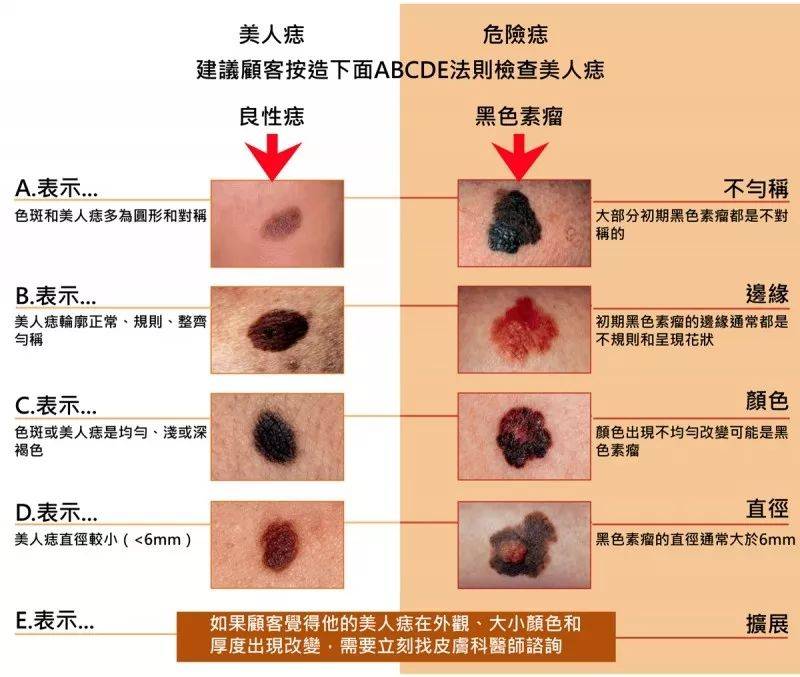 根据Eileen Tan医生,你能利用ABCDE条例,来检查可疑的痣: