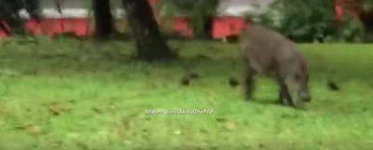 同天,在新加坡的另一端,蔡厝港大牌562,一只野猪在组屋楼下的草地上“散步”,吸引了一群公众围观,而野猪并没有被这些人类吓著,继续到另外一块草地上“走走”。