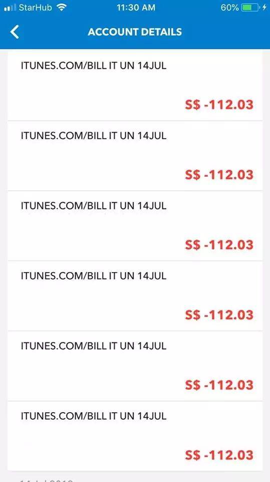 据了解,一名男子Gabriel Lim也于今年收到高达$200新币的欺诈性的iTunes交易的账单!