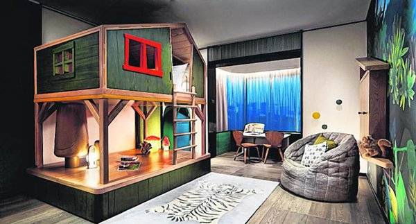 在树屋主题的套房内,有阁楼床能让儿童爬上去睡觉和玩耍,墙壁上还粘有叶子图案的墙纸以营造身处在树林里的感觉。