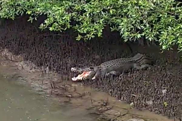 最近面子书上出现一段不到20秒的视频,拍摄一只河口鳄鱼在双溪布洛湿地保护区的红树林泥潭上歇息,它张大著嘴,露出尖利的牙齿,静止不动。