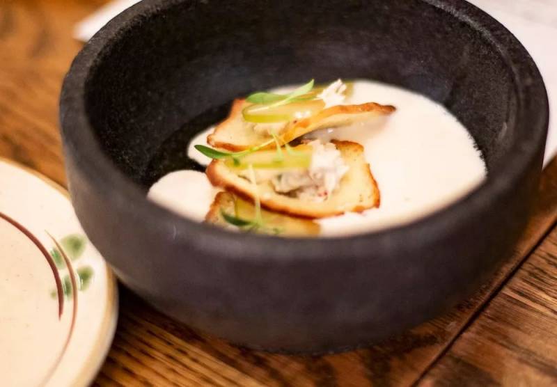 第三道是冷杏仁汤(S$17)。杏仁汤里放了蟹肉和苹果片。苹果片中和了杏仁的味道,反而比中式的杏仁糊要更清新。