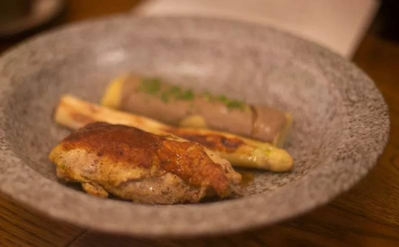 这一道烤鸡肉、鸡肉卷与白芦笋(S$55)足足是两个人的分量。鸡肉一点也不柴,配上羊肚菌等本身味道就很鲜的配料,多汁美味。