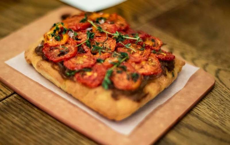 用番茄,百里香与大葱煎烤的面包上面铺满小番茄,味道有些偏酸却非常香,完全品尝不出是无麸质的烤面包。