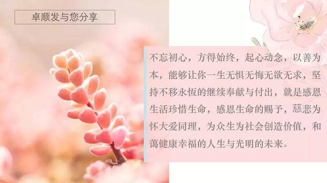 “众生知感恩,而天下安宁;众生知自觉,而天下太平。”卓顺发期望人人都能从小事做起,从帮助身边人做起,因小善而得大善,善必大焉。从头脑睿智、锋芒内敛的学者派企业家到将重心全部放于慈善事业的慈善家,卓顺发通过超脱的修养与智慧把经历谱写成乐章,他心怀感恩,倾情付出,以内在的光亮,照亮了前行的慈善道路。