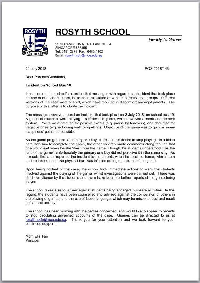 校长在信函中表示,由于流传的简讯中,对事件有几个不同版本,引起家长的不安,因此通过信函澄清事件。这起事件发生在本月3日,一群乘搭第19号校车的学生当时在玩一个“自创游戏”,“游戏的目的是尽可能地获取更多‘快乐’分数。”