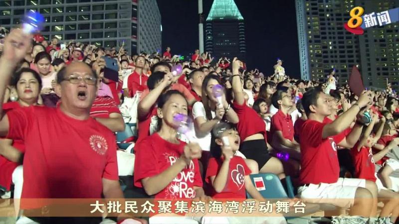 摇着手中的泡泡灯,配合演出歌曲齐声歌唱,大批民众聚集滨海湾浮动舞台参与今年国庆庆典首场预演。