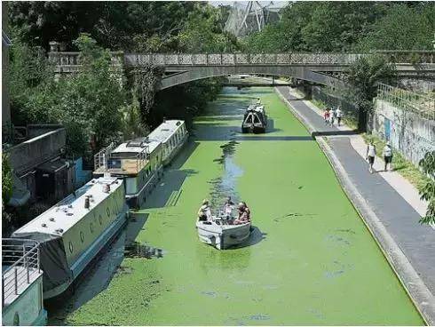 高温导致摄政运河里的绿鸭草生长迅速。