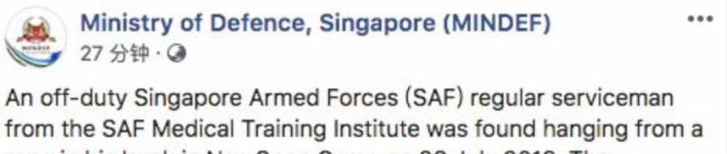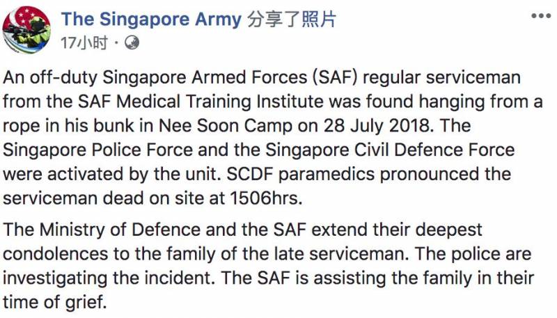 昨天(7月28日),新加坡义顺军营中,武装部队医疗训练学院的一名正规军人被发现吊死!新加坡武装部队发布脸书,公布了这一沉重的消息.....