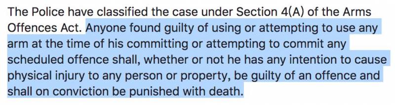 尽管有惊无险,但是该男子抢劫却涉及“军火”,违反了新加坡军火法令。法令规定:任何人被发现使用或试图使用军火来干案,无论蓄意或无意对他人或财产造成伤害或损害,如果罪名成立,可被判处死刑!