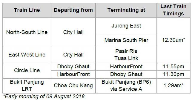 2018年8月8日星期三是新加坡国庆节前夕,SMRT将延长地铁服务时间