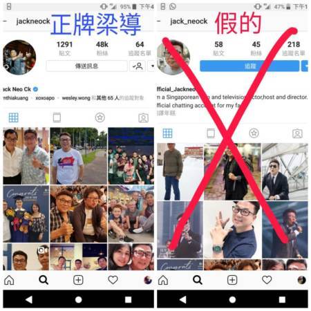 梁志强说,为了方便大家辨认真伪,粉丝们特别截取了真假账号的图,并将它们合成在IG公开,且告知大家“只有在界面出现蓝色勾勾的才是真账号”。