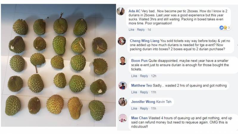 盛港民众俱乐部举办号称本地“最大规模”的盛大榴梿节。一些原本购票到现场换取榴梿的公众却碰到断货的情况,现场大排长龙。有民众更排队苦等4小时,结果空手而归。原本是一场榴梿狂欢,最后却在民众的抱怨声中收场。盛港民众俱乐部回应时指出,这批榴梿中有很多质量欠佳,因此可能会有食用风险。