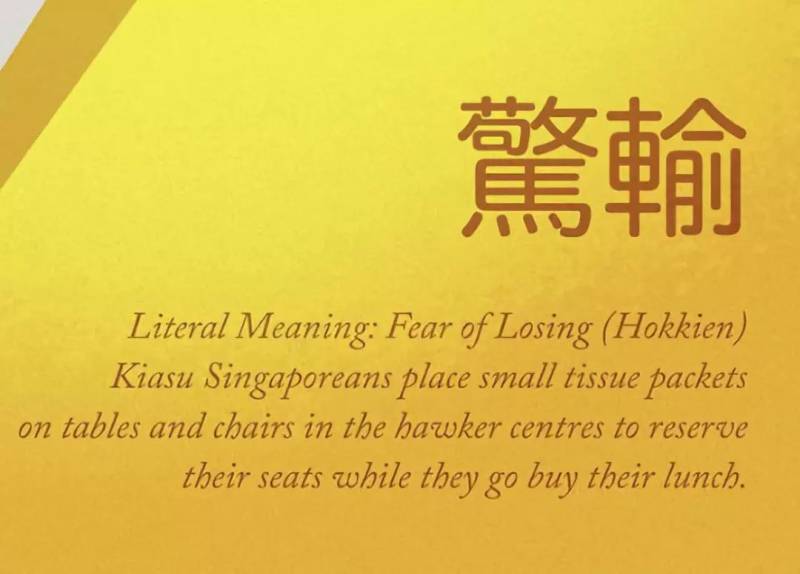 新加坡式英语中有个独特的词汇“Kiasu”,源于福建语“惊输”,意思是“怕输”,害怕事事落后于人。