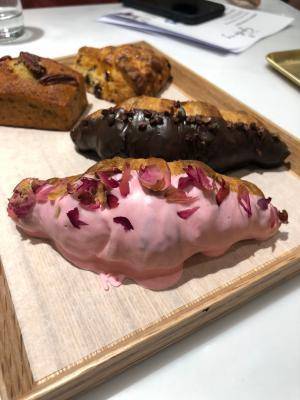 别看可颂粉嫩嫩的外表像及了草莓口味,其实是师傅使用玫瑰花瓣调出的美丽颜色,最后再在可颂上面撒上干燥的玫瑰花瓣,让你在品尝著牛油味浓郁口感酥脆的可颂面包时,能尝到淡淡的玫瑰香味。