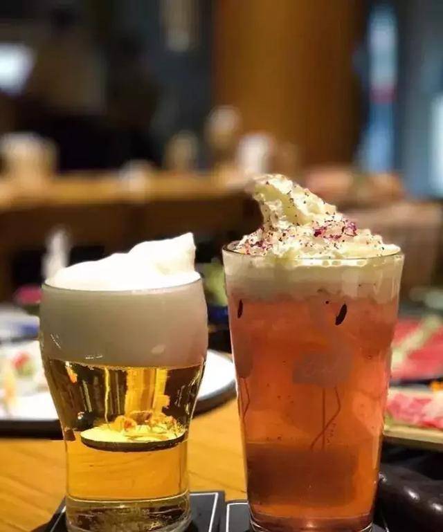 冰淇淋啤酒,上面一层是绵密的冰淇淋,下面搭配啤酒,喝的时候,先抿上面的冰淇淋,再来一口啤酒,嘴里既有啤酒的麦芽香味,又有冰淇淋的甜味,混搭烧肉简直是绝配。