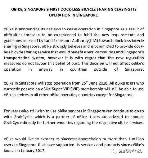 共享脚踏车业者oBike上周一(6月25日)突然宣布,