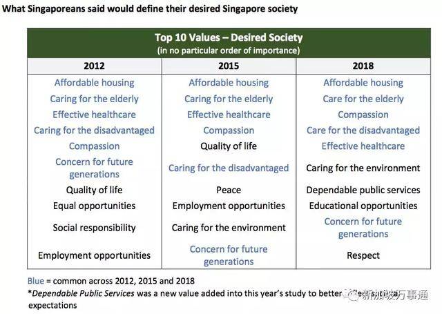在被问及理想中的社会时,大家连续三届都认为,负担得起的住宅和照顾年长者是理想社会最重要的两大特征。虽然新加坡政府倡导“居者有其屋”,但“住宅”仍然是新加坡人认为理想社会最重要的东西。