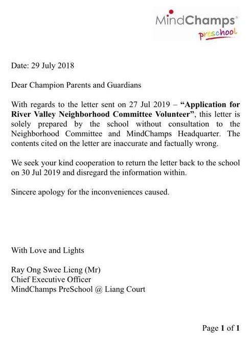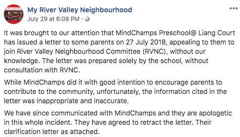 本地一名网友将MindChamps幼儿园发给学生家长的一封信,拍照并上传至脸书,大骂幼儿园和里峇峇利邻里委员会(River Valley Neighbourhood Committee)!