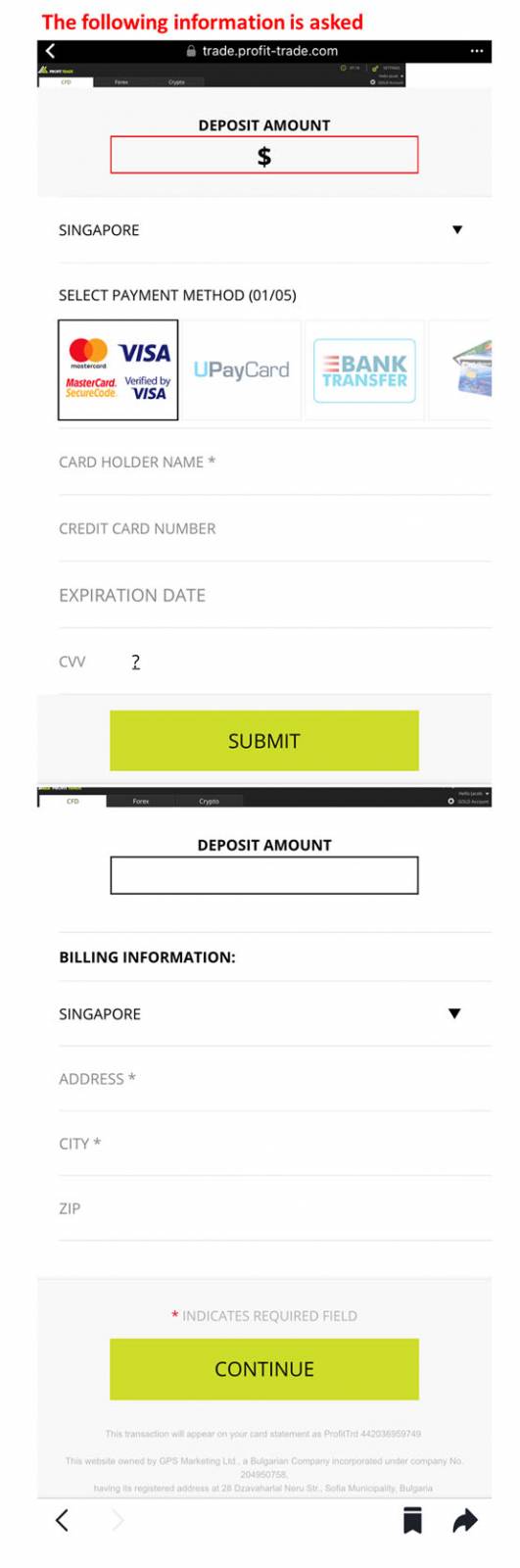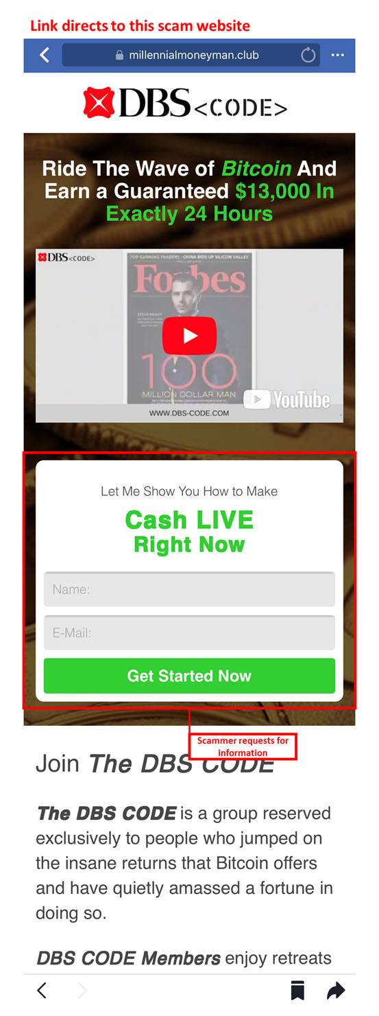 用户点击广告连结后,就会进入一个申请加入星展银行会员DBS Code的诈骗网站。假网站承诺用户,只要通过投资比特币,就能在24小时后赚取超过1万3000元。诈骗网站也要求用户输入自己的信用卡资料和住址。
