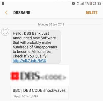 不少用户在星展银行的Facebook页面留言,表示自己收到来自银行的可疑手机简讯。手机简讯的英语语法出现不少错误,内容提到:“星展银行最近推出新软件,能够让数百名国人成为百万富翁”。简讯里还有一个网络连结,让用户点击来“查询自己是否符合资格”。这则手机简讯的发送人是“DBSBank”。