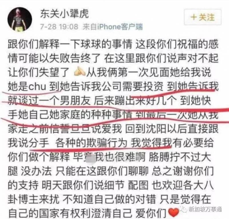 7月28日的时候,东关小犟虎发微博,宣布自己和球球分手了,而且透露分手是因为球球在交往期间对他各种欺骗,疑似只看上了他的钱而非他的人,以一句“胳膊拧不过大腿”无奈分手,言语中都是委屈。