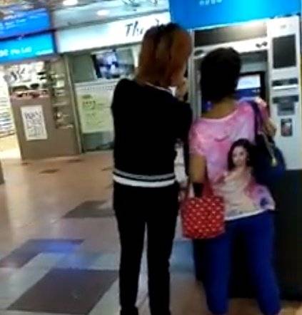 一名女员工手搭著阿嫂的肩膀,看着她提款。(视频截图)
