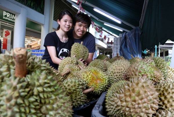 两人为了庆祝结婚两周年,同时回馈顾客的支持,特别准备了两吨榴梿,分昨、今两天在摊位免费送。