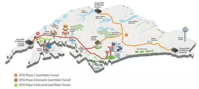 对污水的回收利用离不开建设深层隧道排污系统工程的建设,新加坡深层隧道排污系统工程分为两期实施,由两条大型深层隧道、五个新生水工厂、深海排污口和一个联结污水管网组成。两个深层隧道的设计直径可达6米,建设在地下20米至50米处,通过连接水道管网与现有的水网系统连接在一起。第1期工程已于2008年完成,包括48km长的北面及支线隧道、60km长的连接污水渠、樟宜污水处理厂及排水渠。第2期工程预计于2025年完工,将把深隧道系统扩展至新加坡西部。2期工程将配套新建2座新生水厂,将新生水利用率从40%提高到55%。2座新生水工厂将建设在屋顶上,最大程度地利用土地。