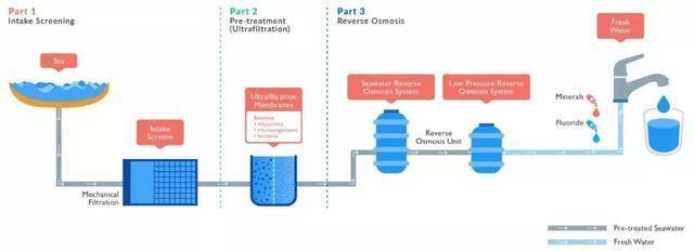 新加坡第二家海水淡化厂是图阿斯普林海水淡化厂,日处理能力达约32万m3。工艺流程是先通过机械筛除,然后超滤膜去除水中杂质、微生物和细菌,接下来仍然是采用反渗透技术。