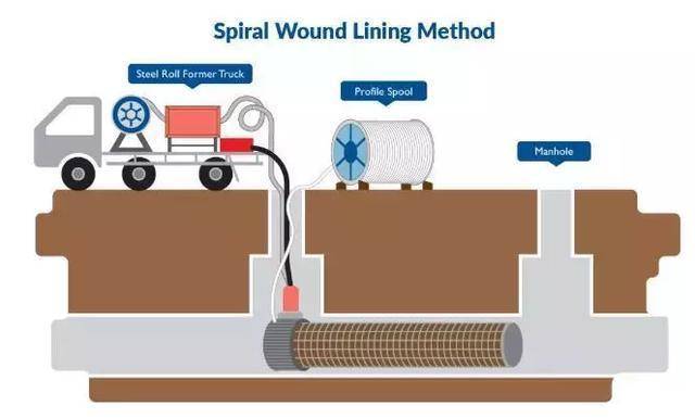 通过人孔以螺旋形式缠绕互锁PVC条带,以在现有管道内形成新管道。