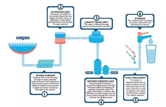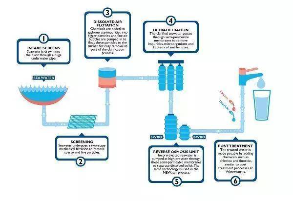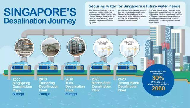 新加坡四面环海,因此新加坡积极投入更经济有效的海水淡化方法。目前,新加坡建造了3个海水淡化厂,总装机容量为130兆加仑,可满足新加坡目前30%的用水需求。另外两个海水淡化厂将在2020年建成。预计到2060年,脱盐水将满足新加坡未来30%的用水需求。