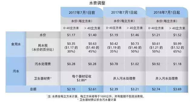新加坡认为水价是反映水资源稀缺价值的重要有效机制,新加坡两阶段的价格调整一方面来源于水处理及水利基础设施的大量投资,一方面也能让消费者意识到水的稀缺价值。新加坡的水费包括水本身费用、水资源保护税、处理处理费用等,根据最新的定价,新加坡居民每吨的水费在2.74美元~3.69美元,折合人民币18.31元~24.65元,远远高于上海的水价。