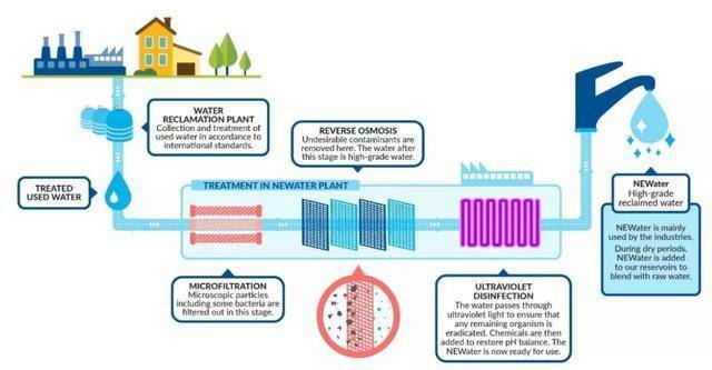 新生水的主要工艺流程是常规水厂出水后先经过精细格栅过滤,再进入微滤或者超滤工艺单元,出水进入反渗透工艺单元,去除细菌、病毒以及大部分溶解盐。反渗透出水进行紫外消毒后成为新生水。新生水通过了15万多项科学测试,完全符合世界卫生组织的要求,可以作为间接饮用和非饮用水使用。作为间接饮用水使用,主要是将新生水和水库水混合后进行进一步处理;非饮用水主要是用于超洁净用水要求的生产过程中,如用于半导体行业的晶圆制造,以及商业楼宇的空气冷却。