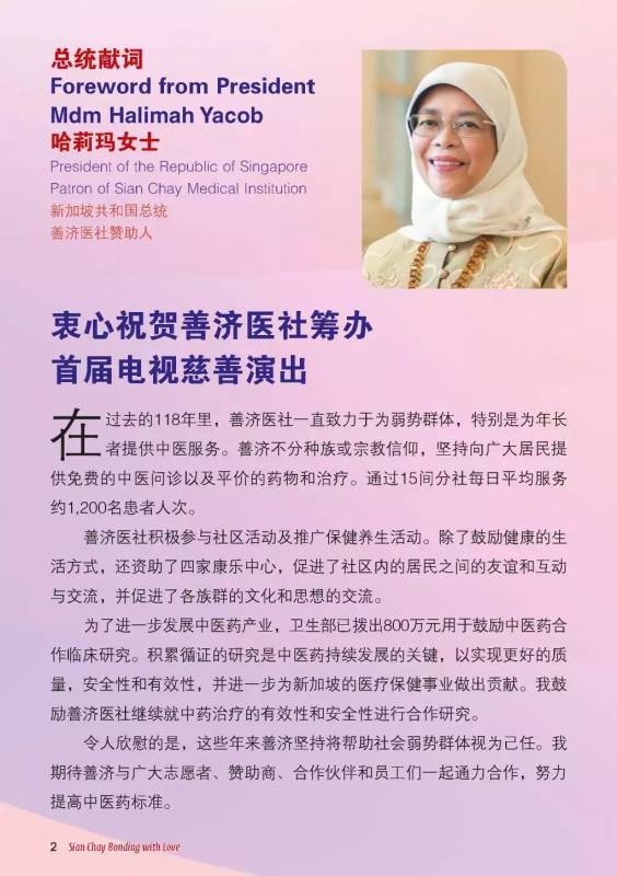 曾经不止一次为善济医社站台的善济医社的赞助人,新加坡总统哈莉玛女士将担任这次电视筹款的主宾。
