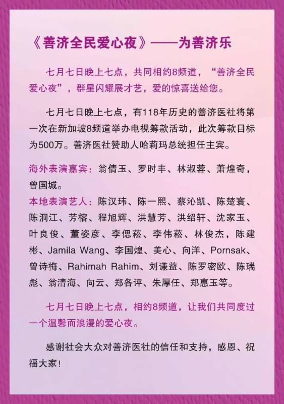 7月7日晚7点,相约8频道,期待大家能和家人们一起观看精彩动人的表演,共同度过一个温馨而浪漫的爱心夜。